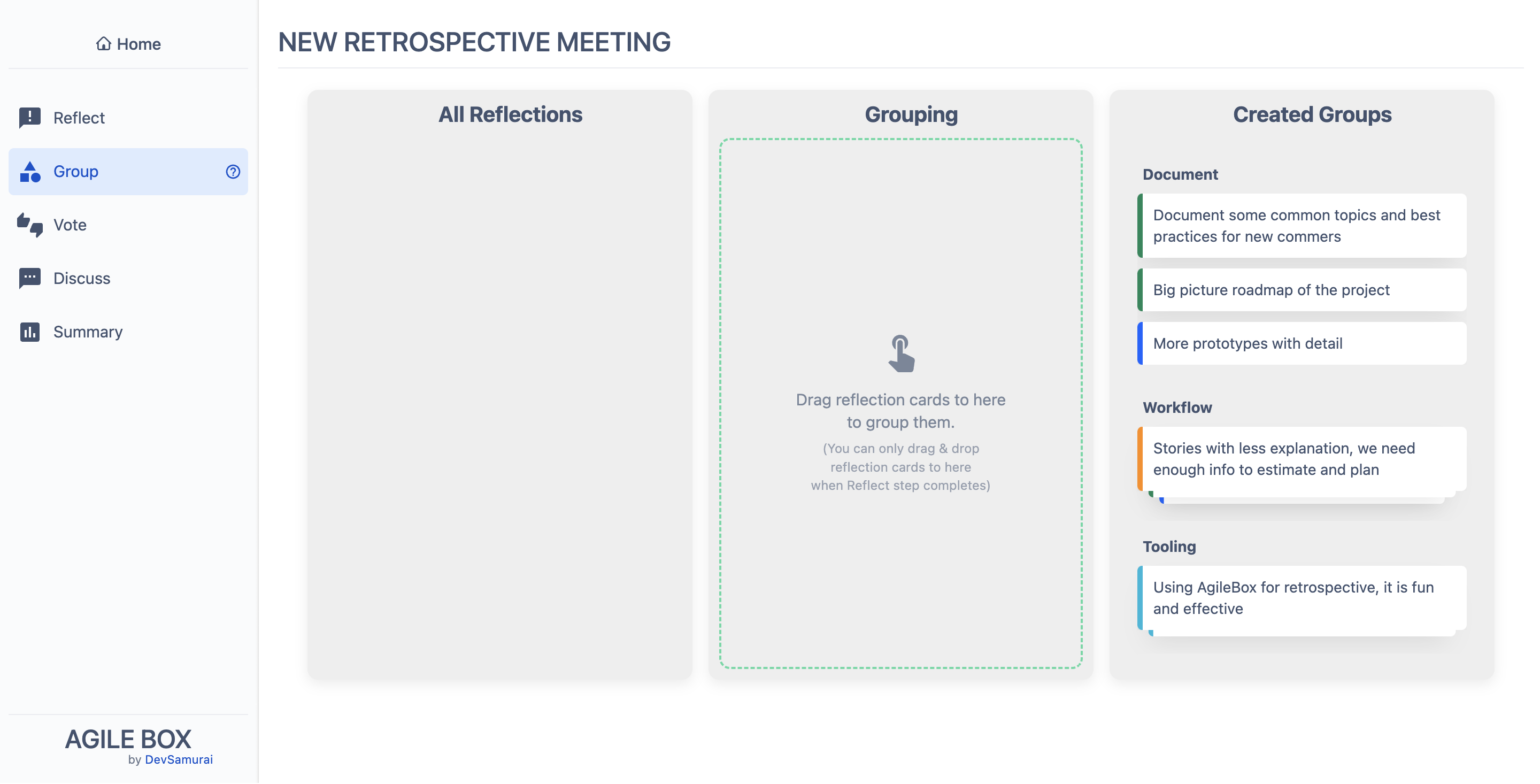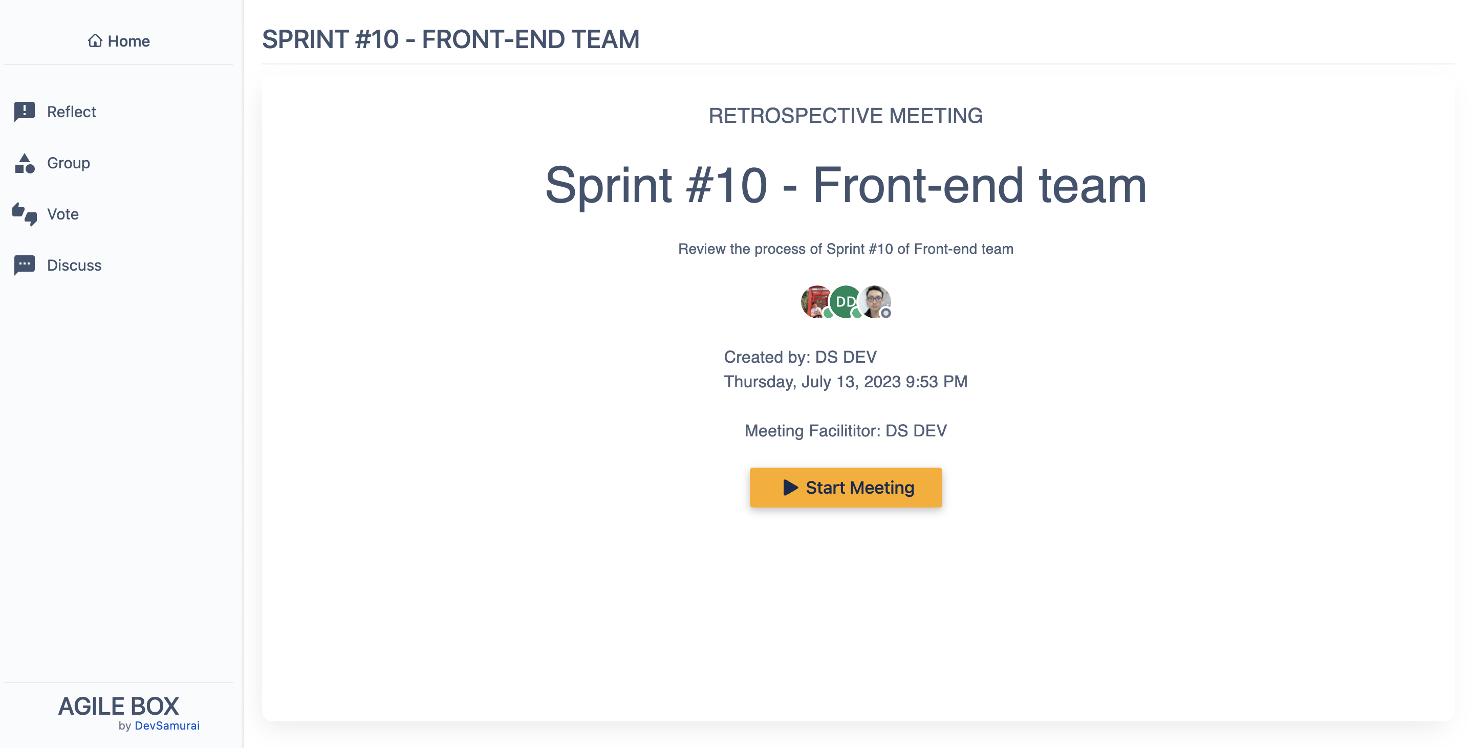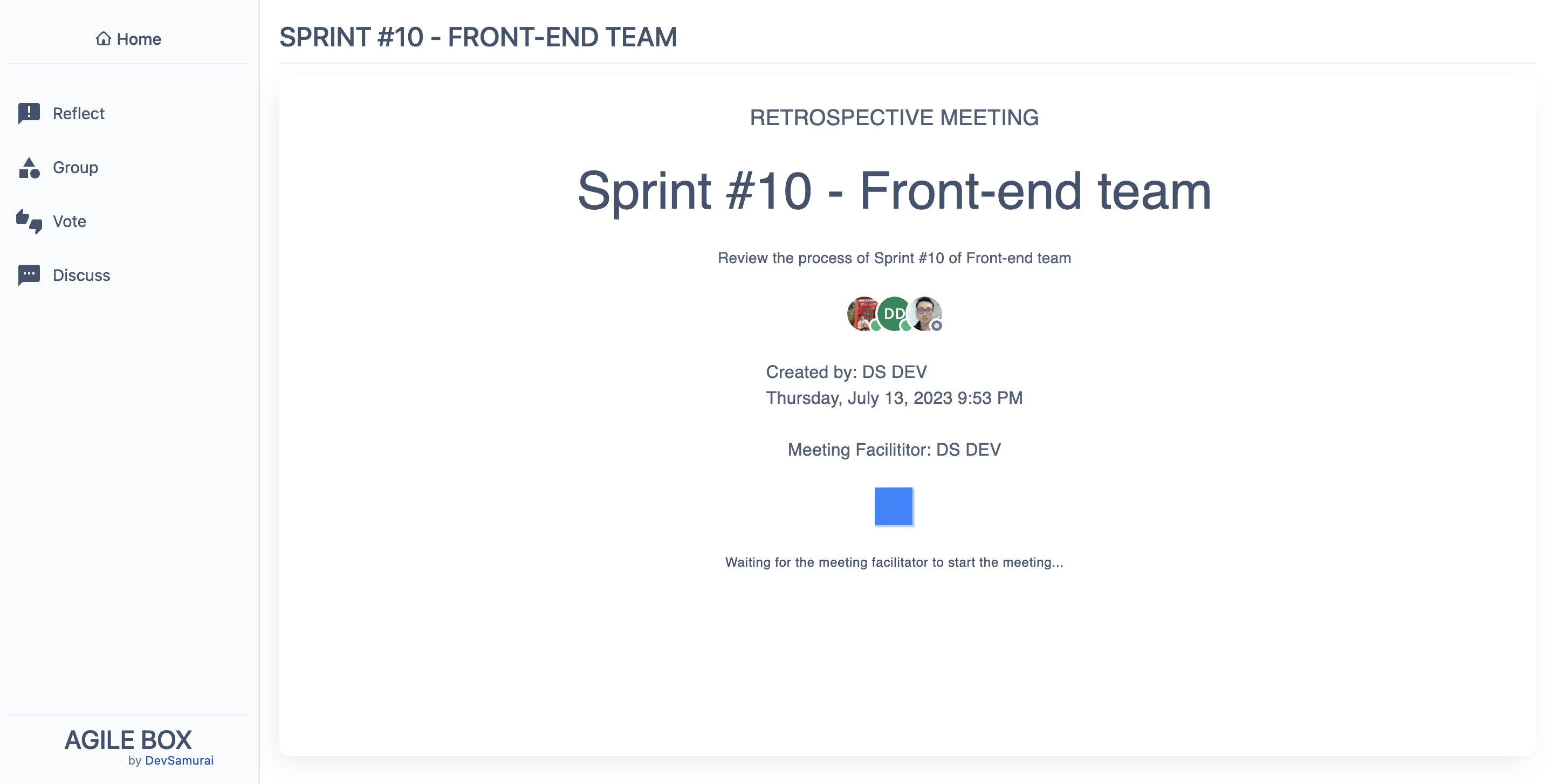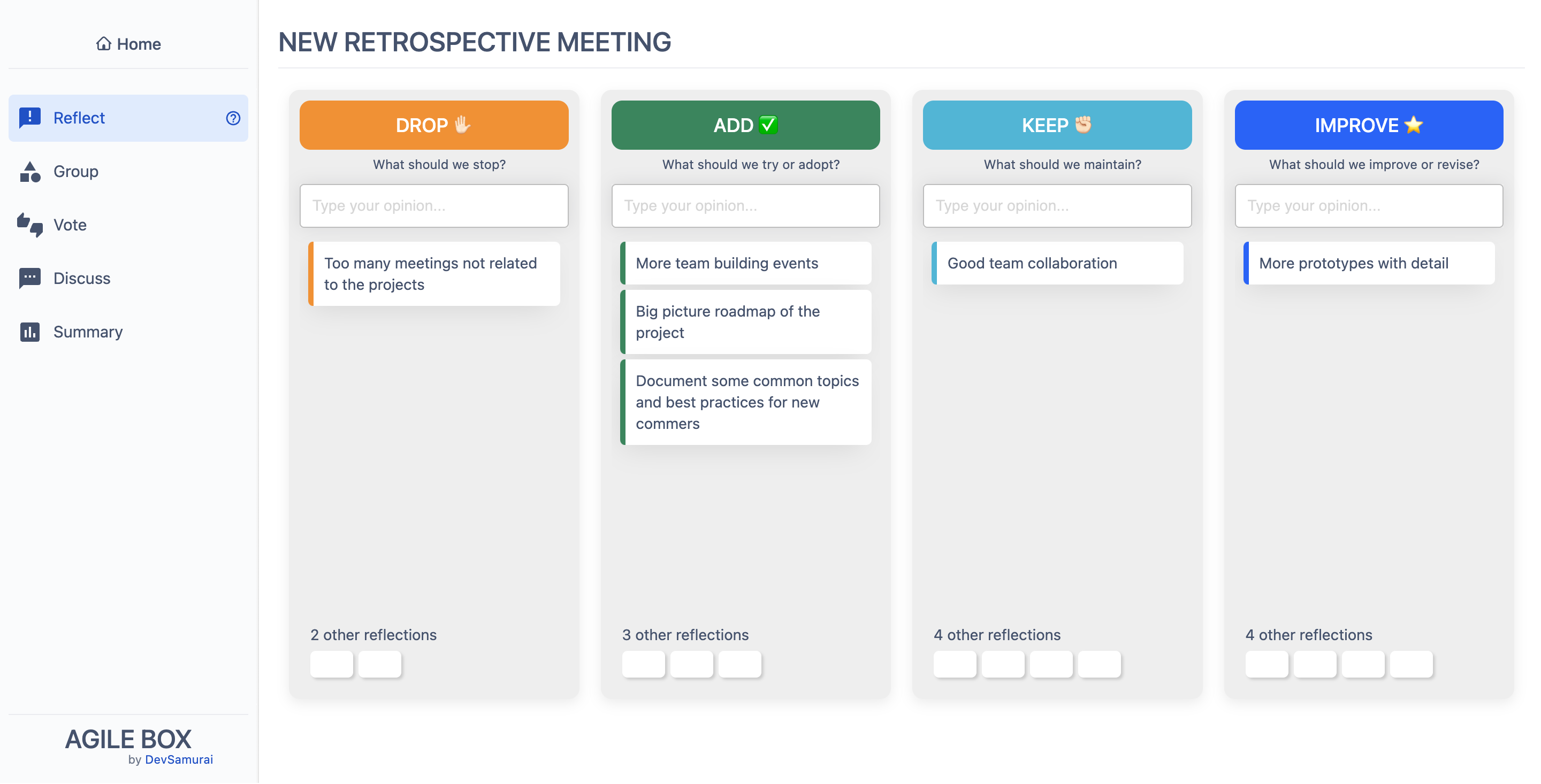 The meeting can only be started by the facilitator. Once initiated, all participants will progress through a total of 4 stages in the retrospective meeting: