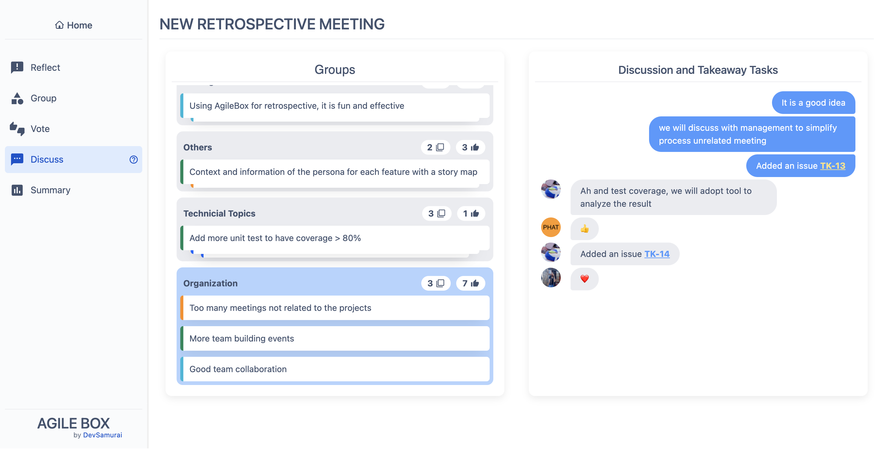 Team members can message and create new tasks by each group of opinions from the previous stages.