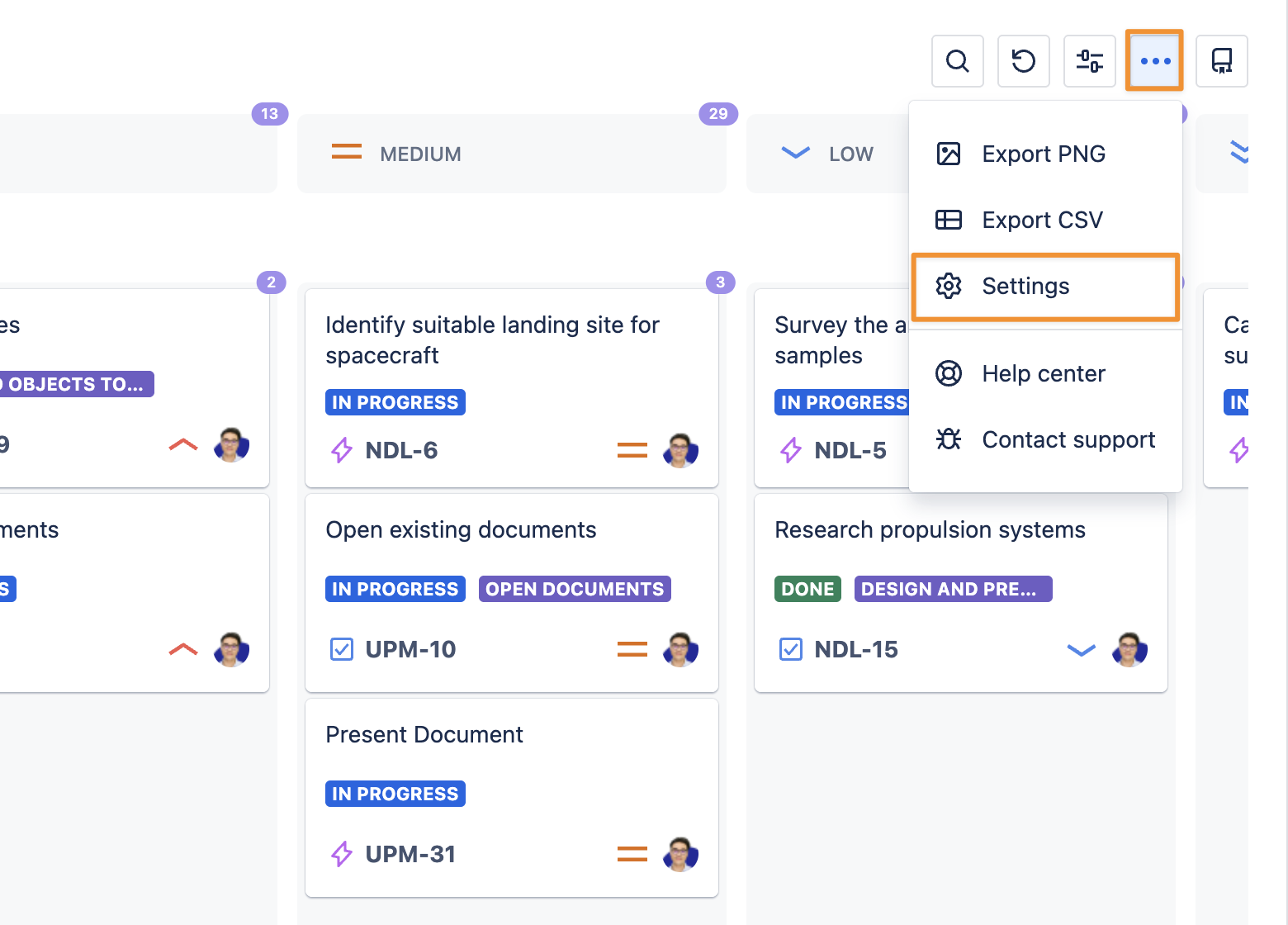 To access Board Settings, click the ellipses (⋯) icon in the top right corner of the board, then select Settings.