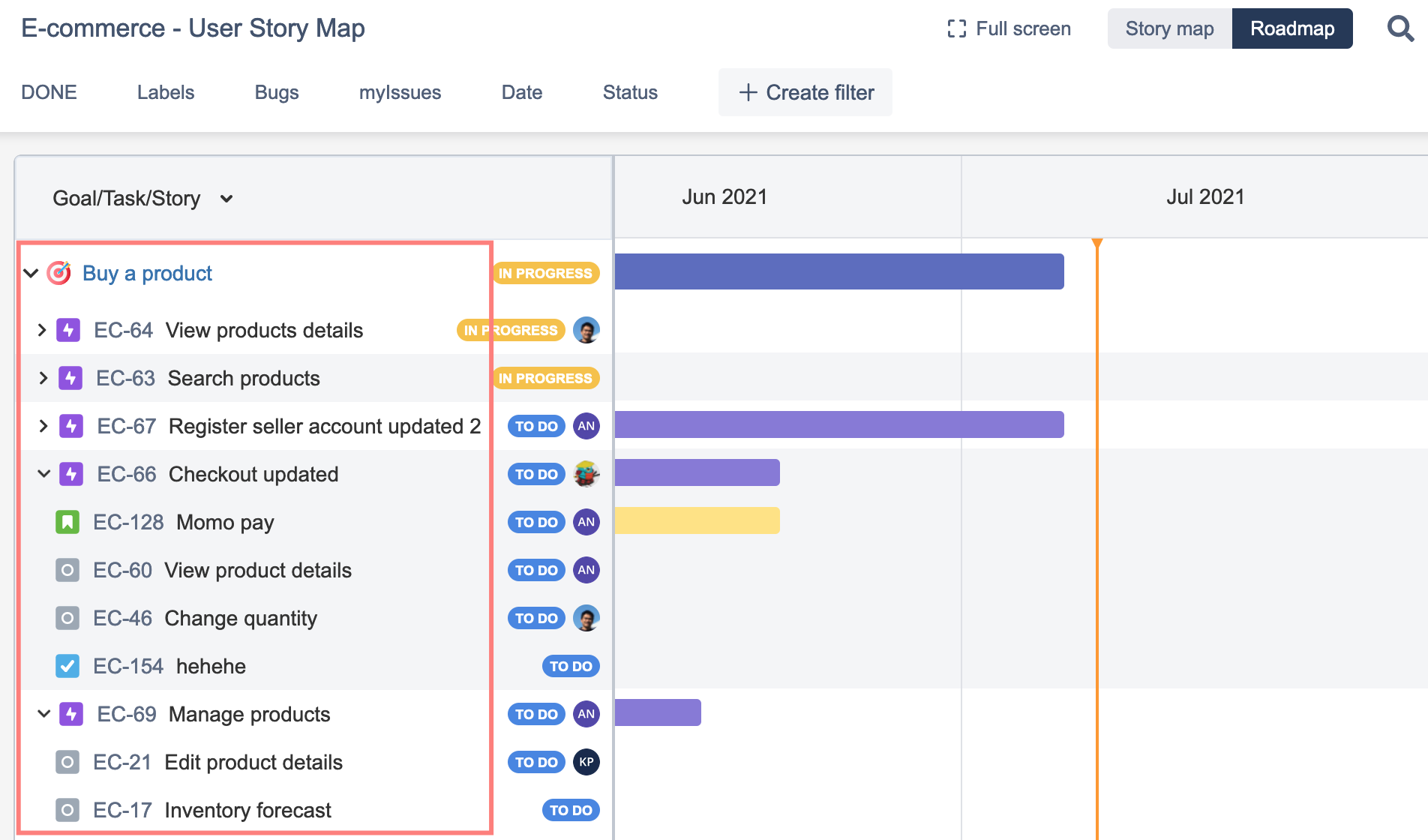 Roadmap view by Goal/Epic/Story a long with release/sprint views