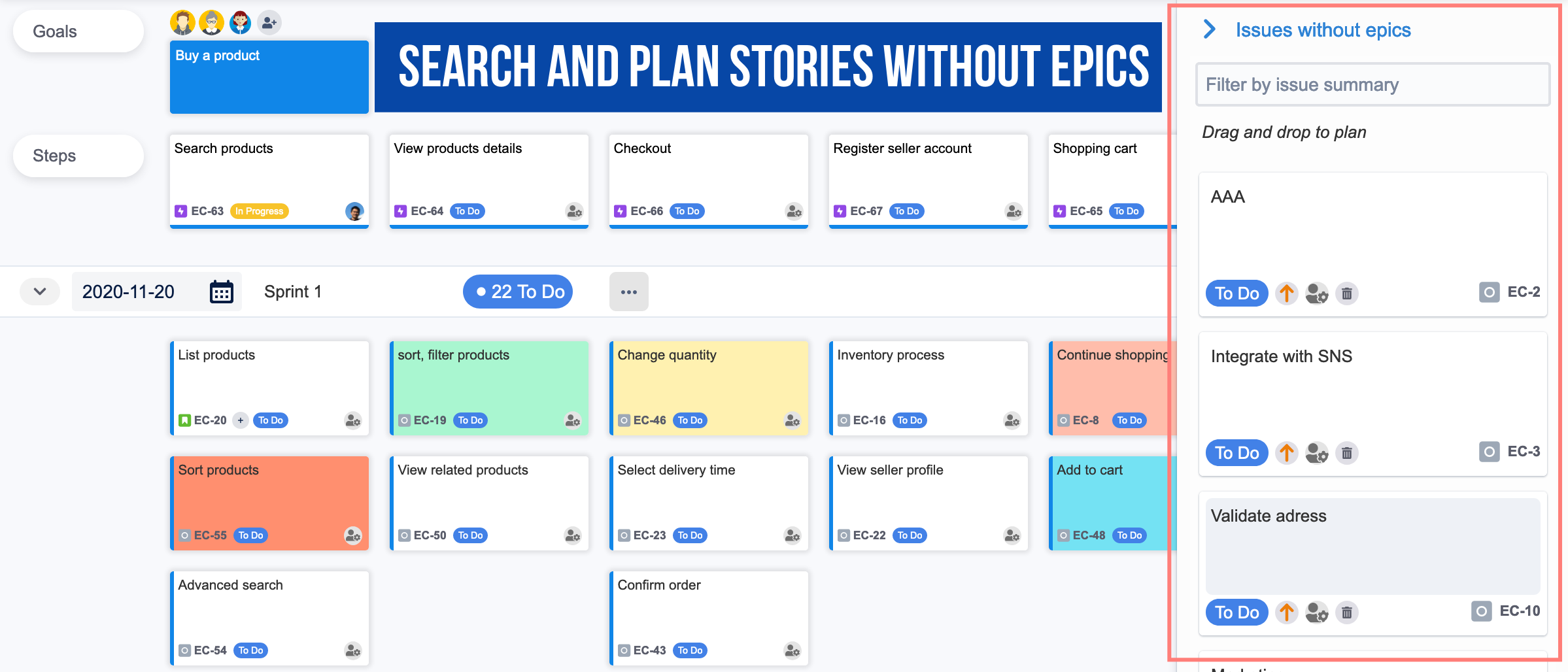 Unplanned issues without epics panel, support search and filtering to find and schedule task easier