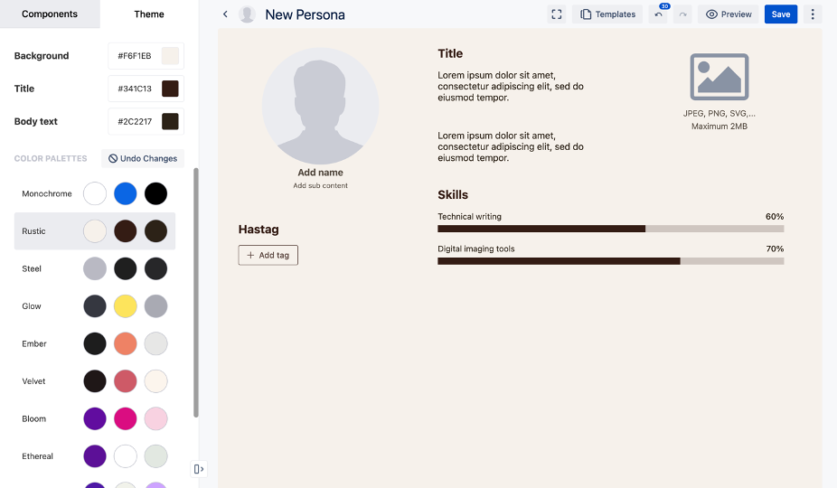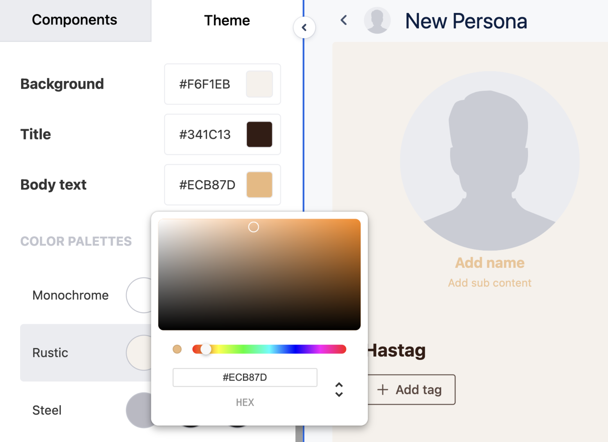The Theme option sits next to the Components panel, giving you quick access to a range of color palettes for customizing your personas.