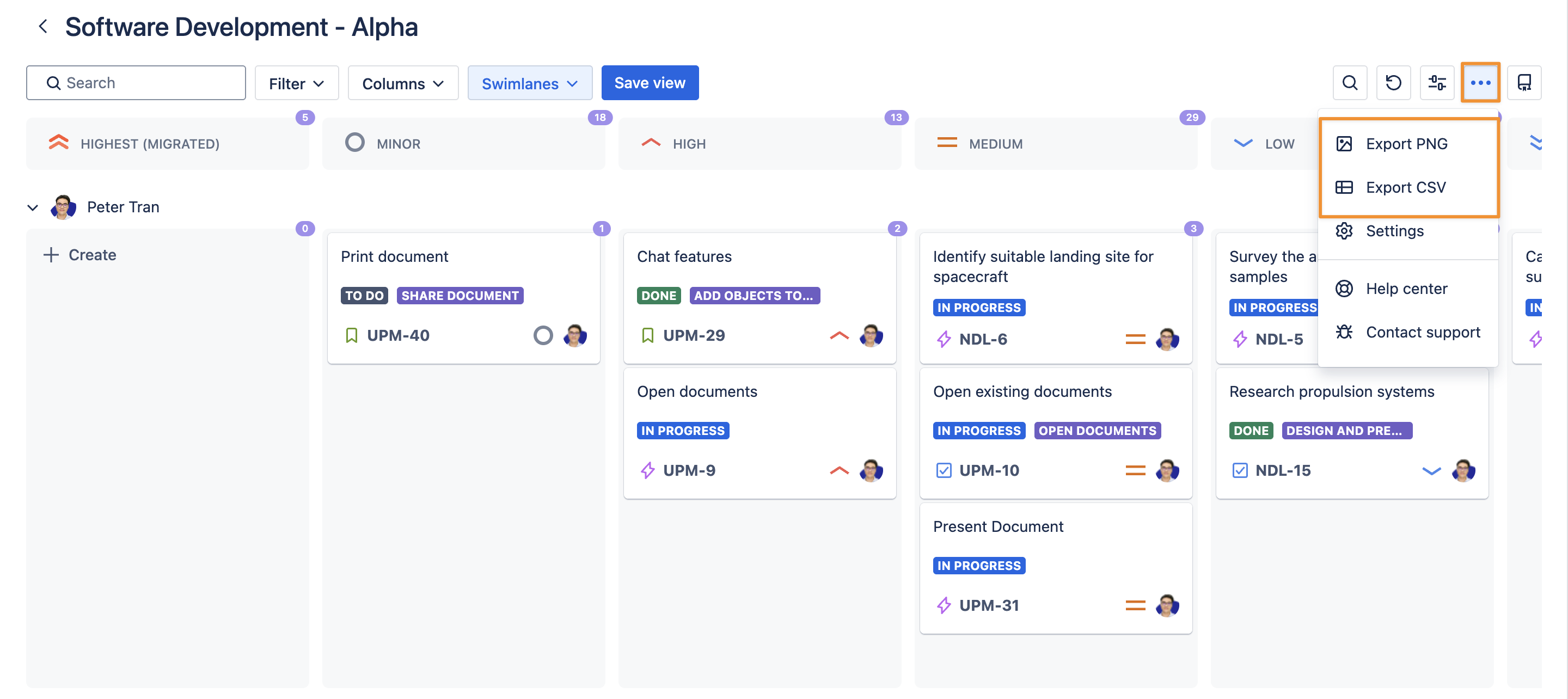 To export your Kanban board, click the ellipses (⋯) icon in the top right corner of the board. You can then choose from the following export options: