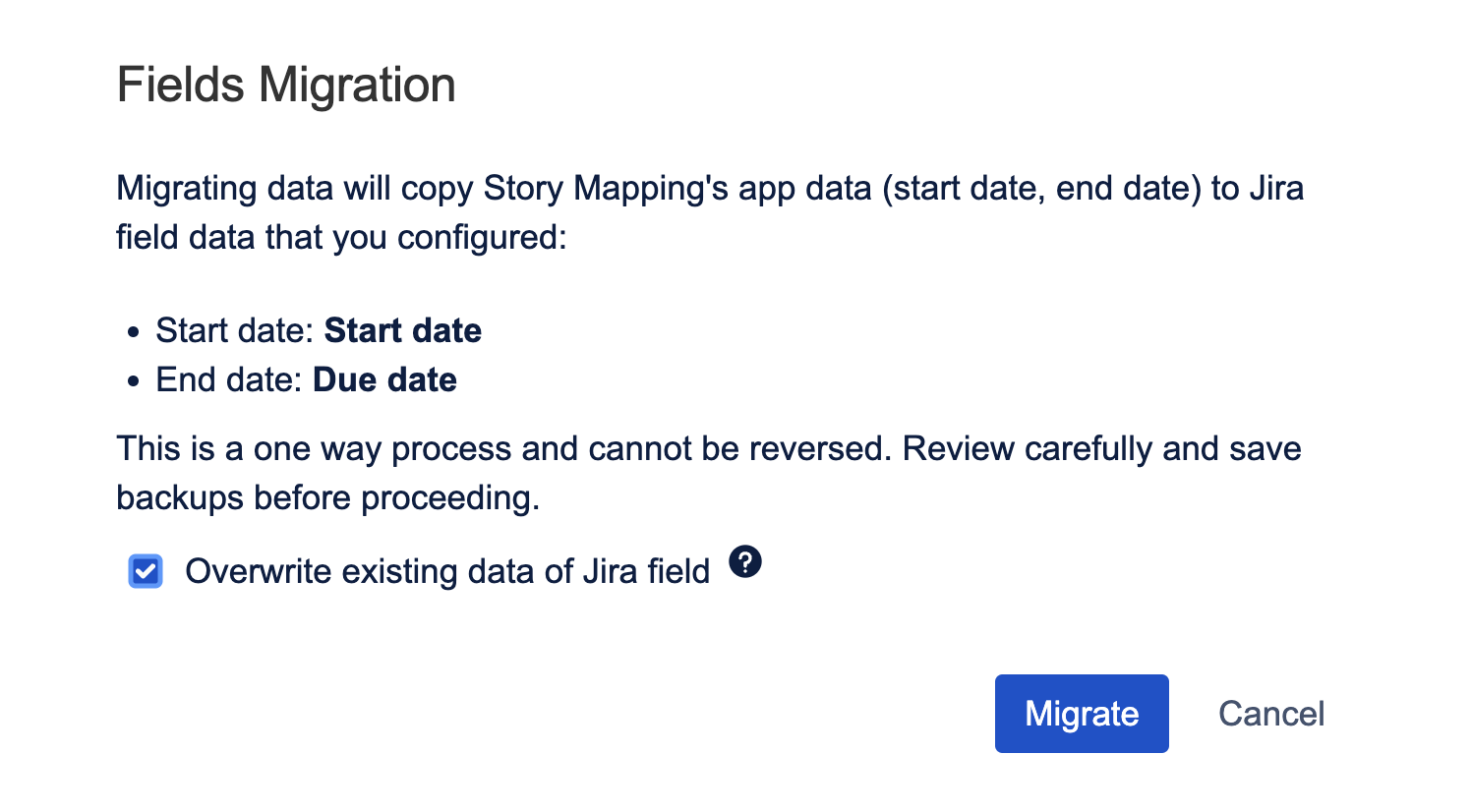 After finishing the setup, click the Migrate button to transfer existing roadmap planning data from ProductGo’s internal storage to Jira fields.