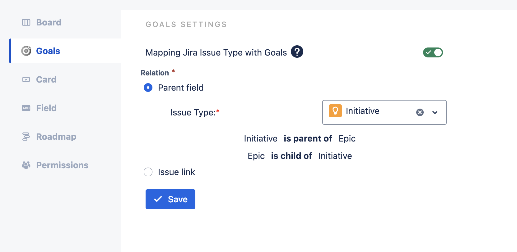 Decide the relationship between Goals and Epics between Parent field and Issue link
