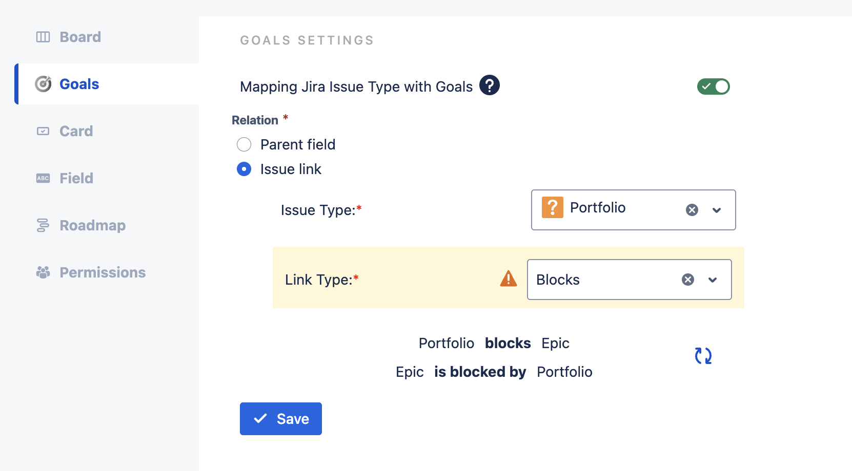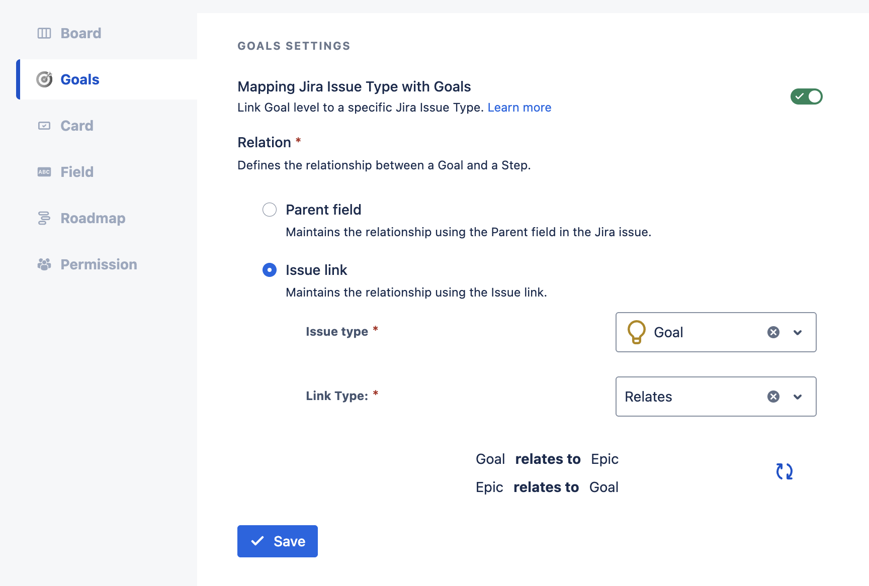 Link type: Select issue link type mapping with goals