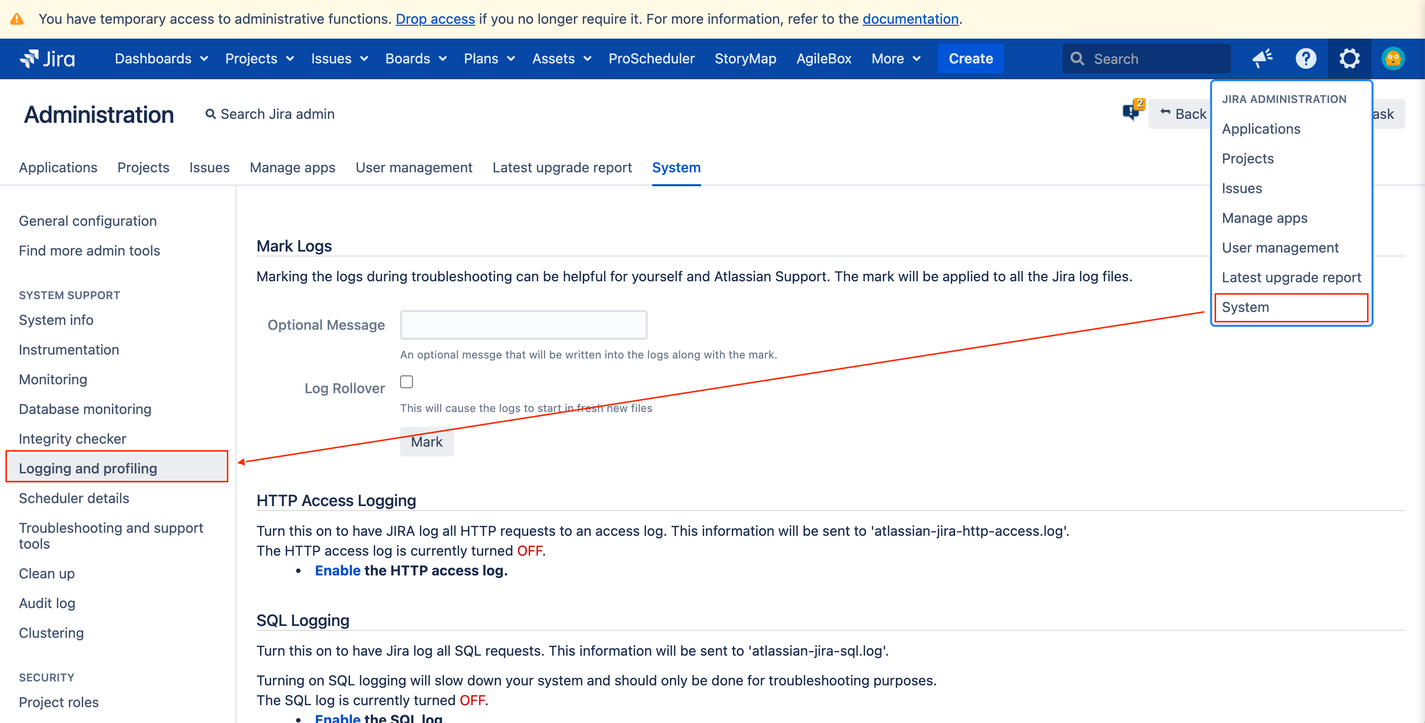 Navigate to the Setting → System → Logging and Profiling tab