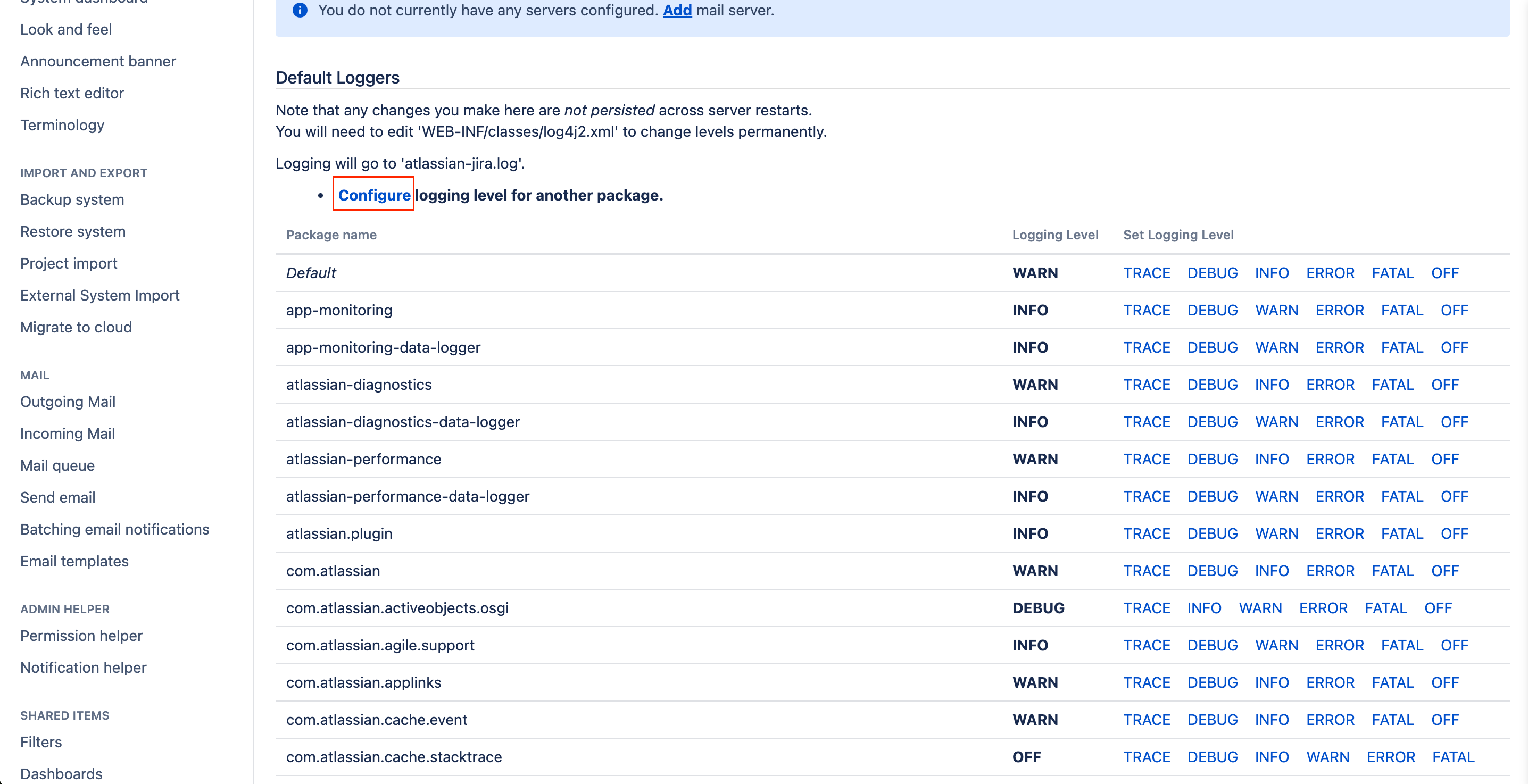Scroll the same page below to go to the Default Loggers section and click on the Configure link