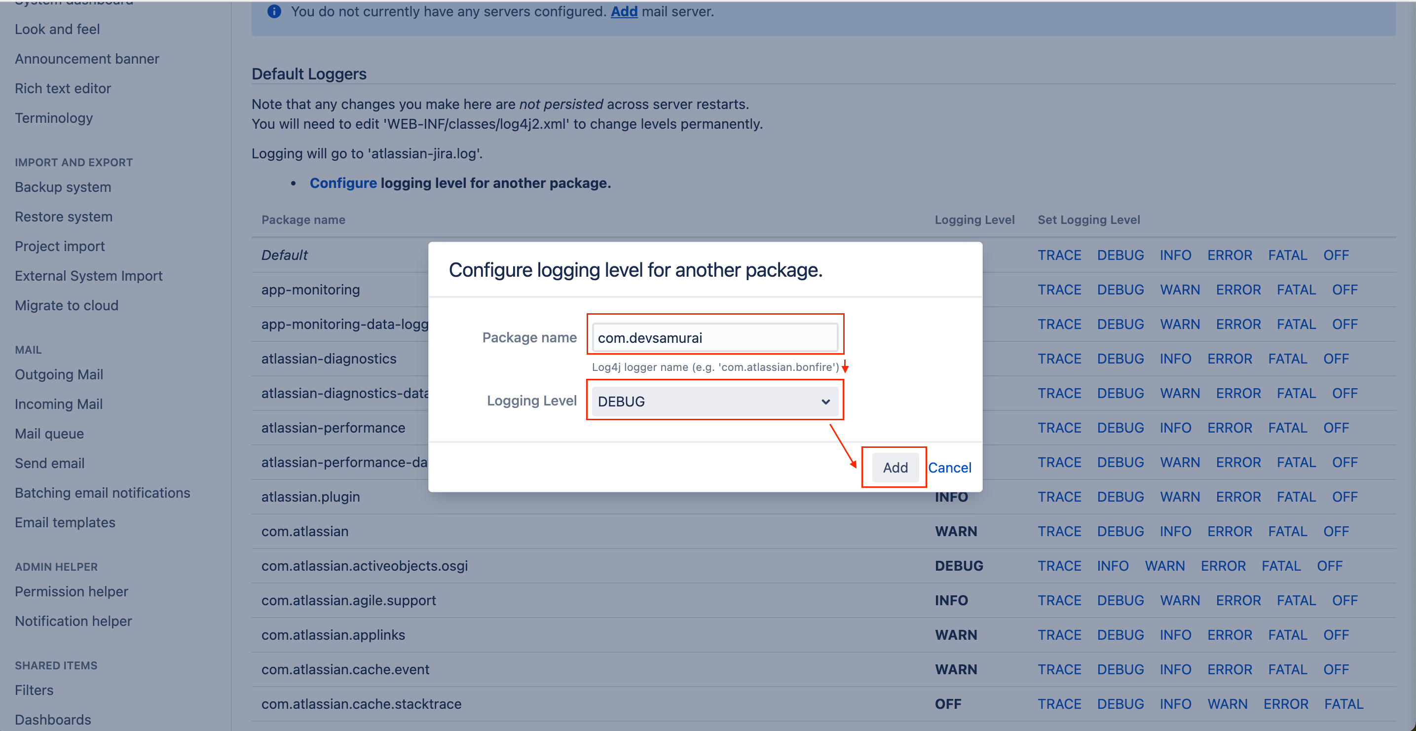 Enter the Package name as “com.devsamurai” and the Logging level as “Debug”. Click on Add.