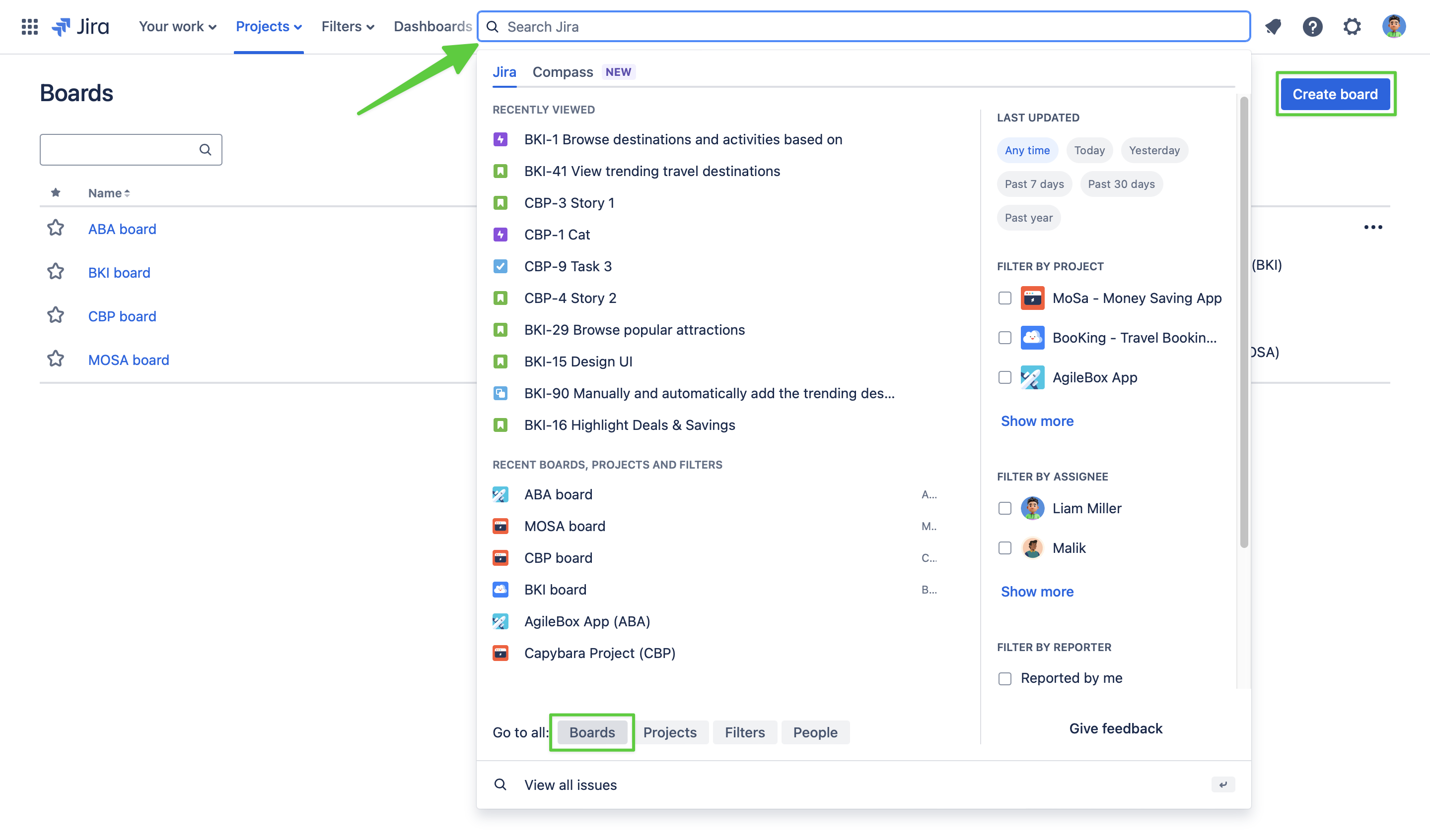 In Jira, navigate to the search bar and select View all boards or Go to all: Boards depending on your Jira version. Click the Create board button.