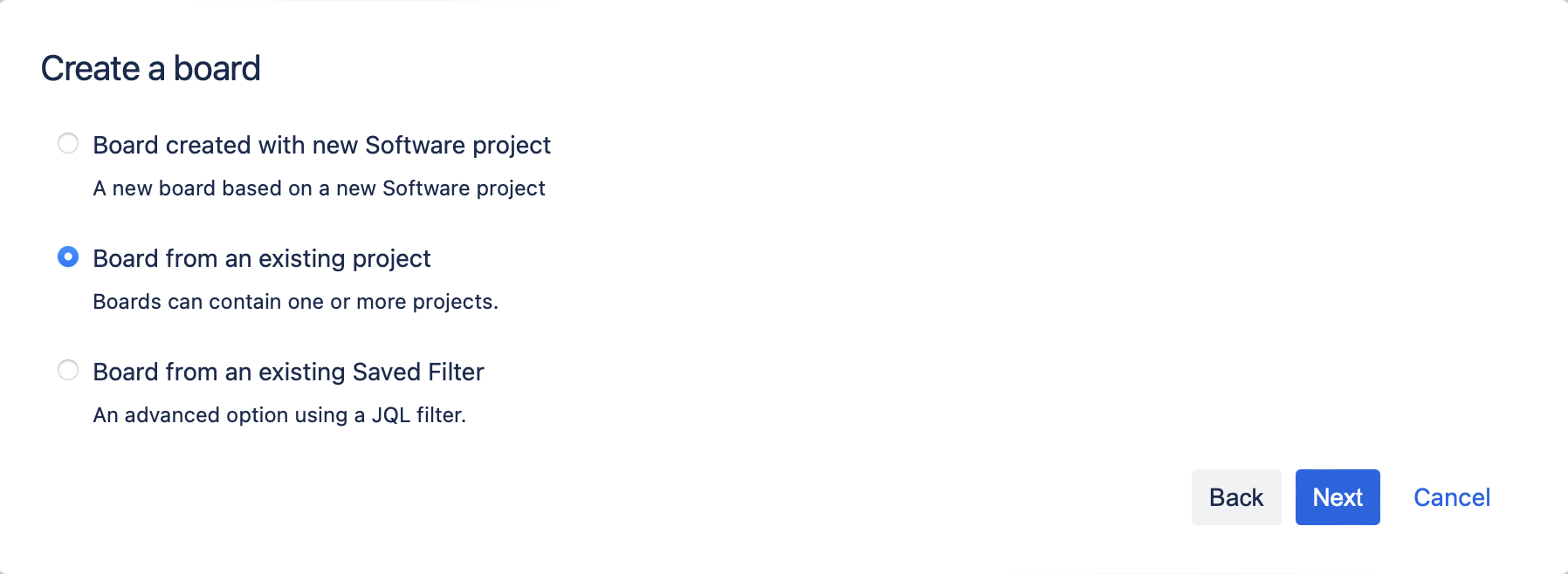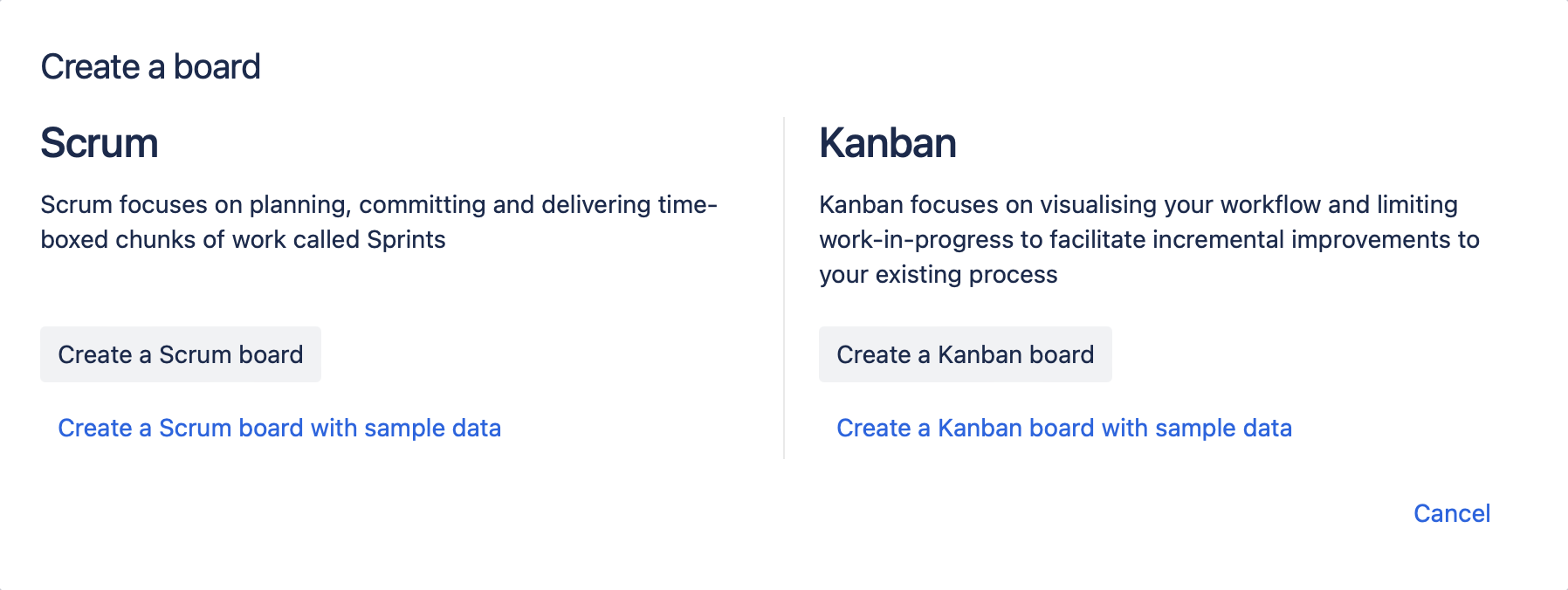 Select Create a Scrum board or Create a Kanban board from the options.
