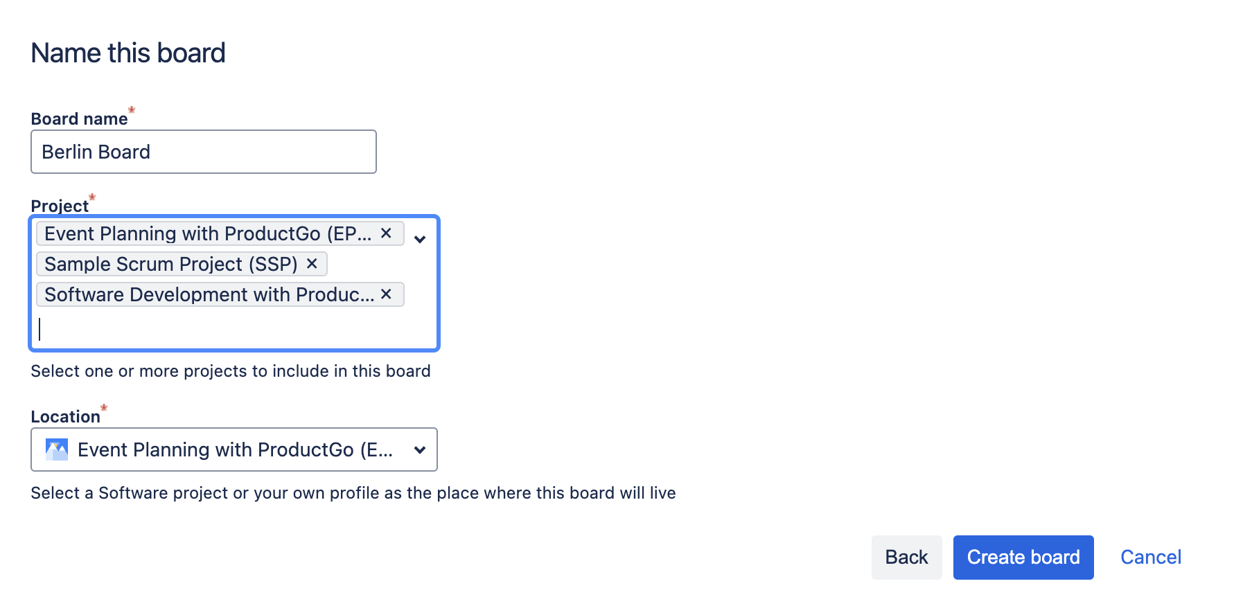Choose the Board from an existing project option then pick the projects you want to manage and their location.