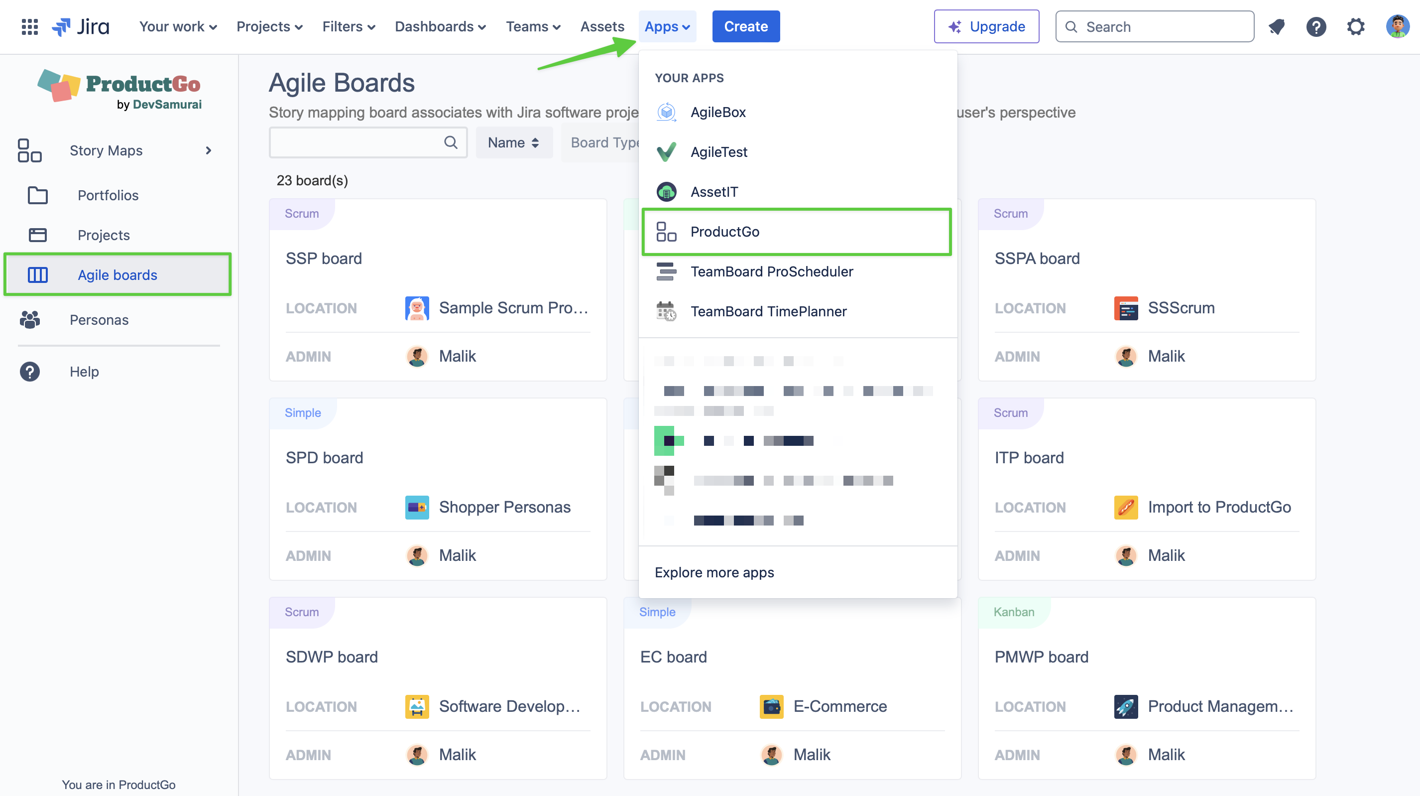 Another way to access Agile boards story map is by going to Apps → ProductGo → Agile boards → Browse and access your board