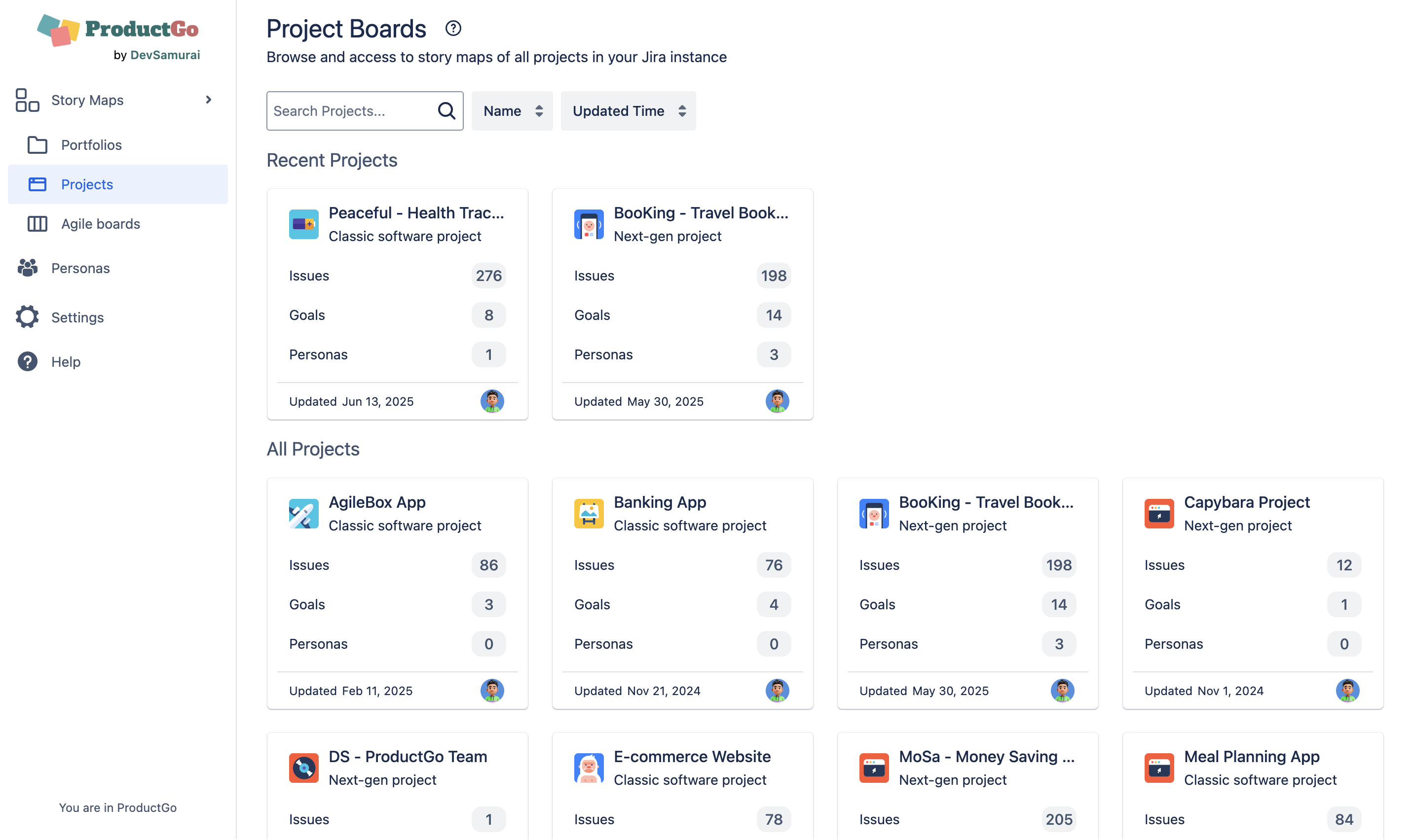 The Projects section in ProductGo allows users to browse and access all available Jira projects directly from the Homepage.