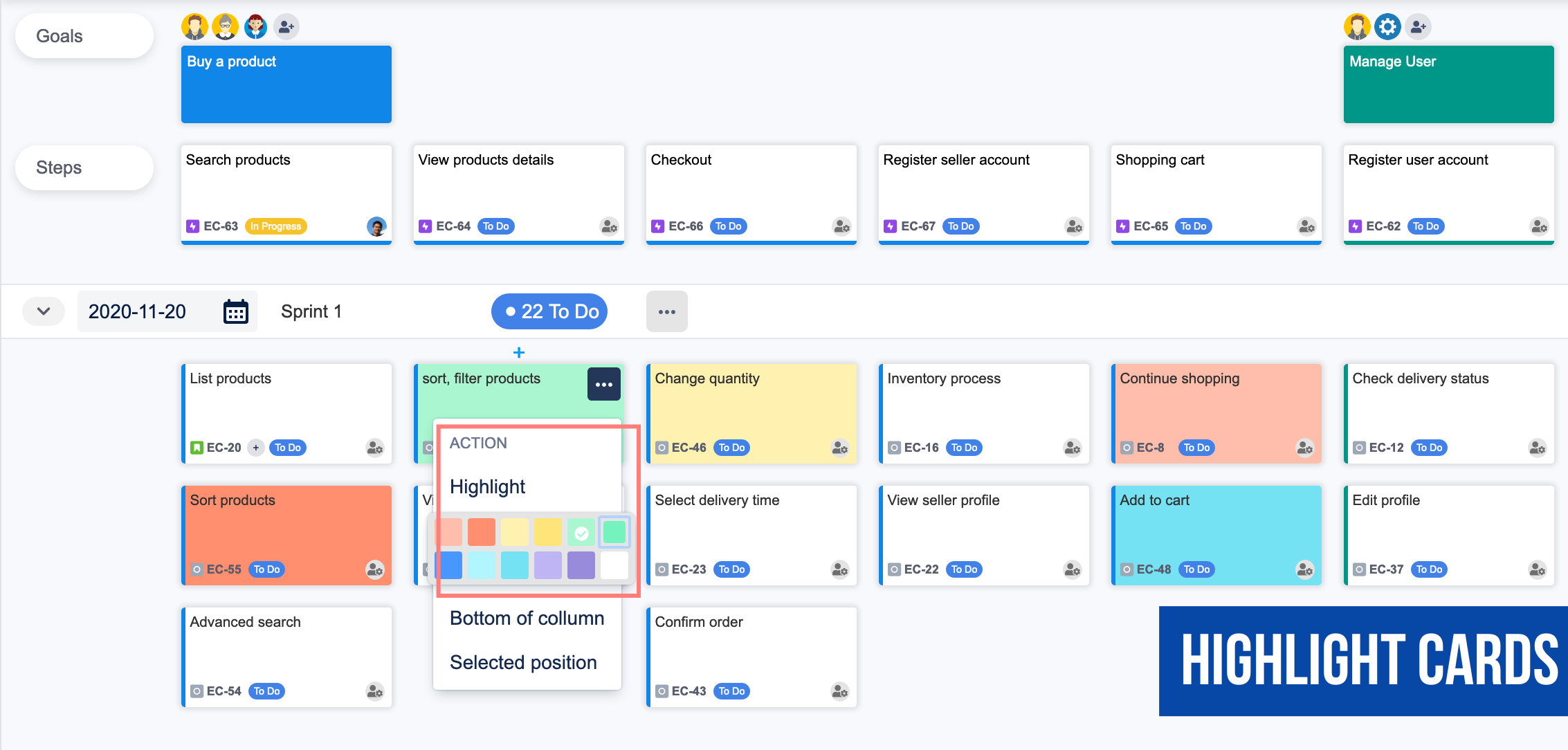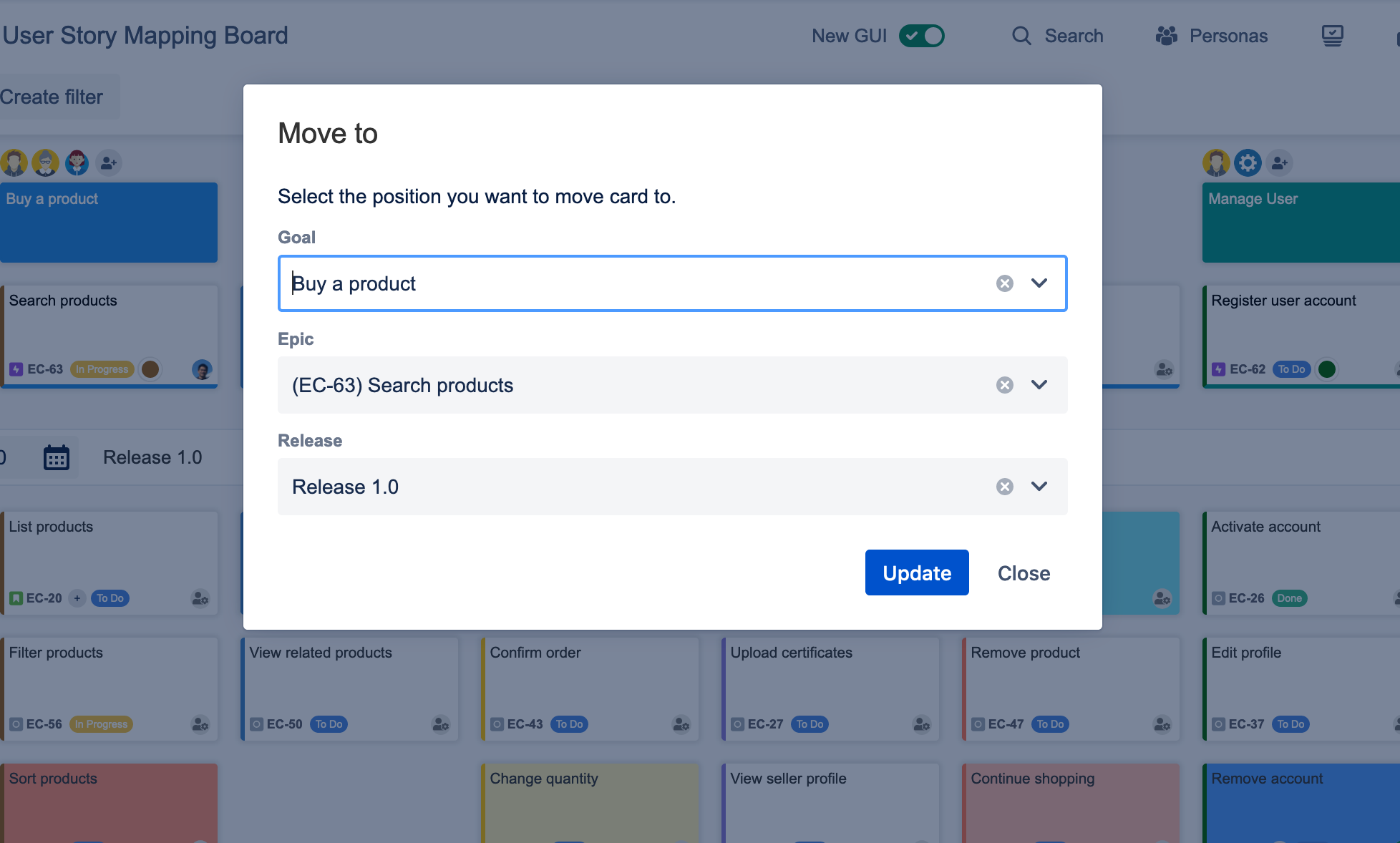 Select position and move card from card’s menu, convenient when moving cards on big boards