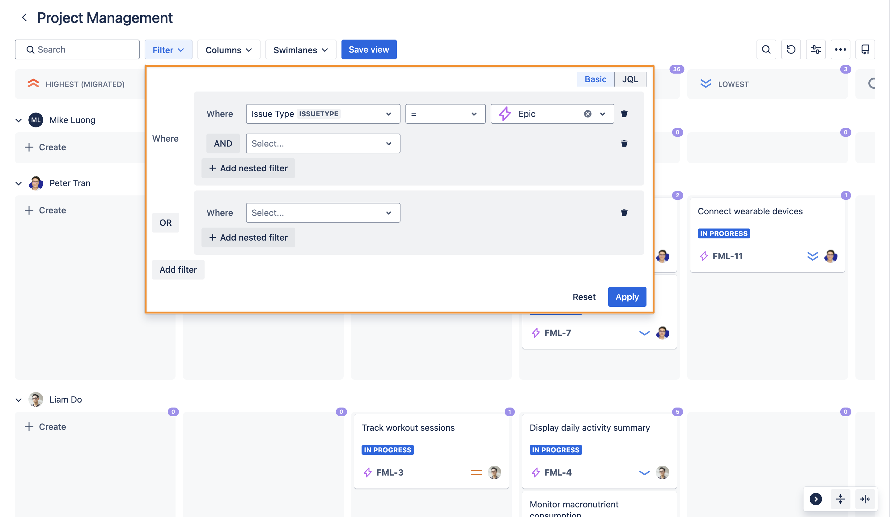 For advanced filtering, you can use Jira Query Language (JQL) to create more precise queries. This option is ideal for users familiar with Jira’s advanced search syntax.