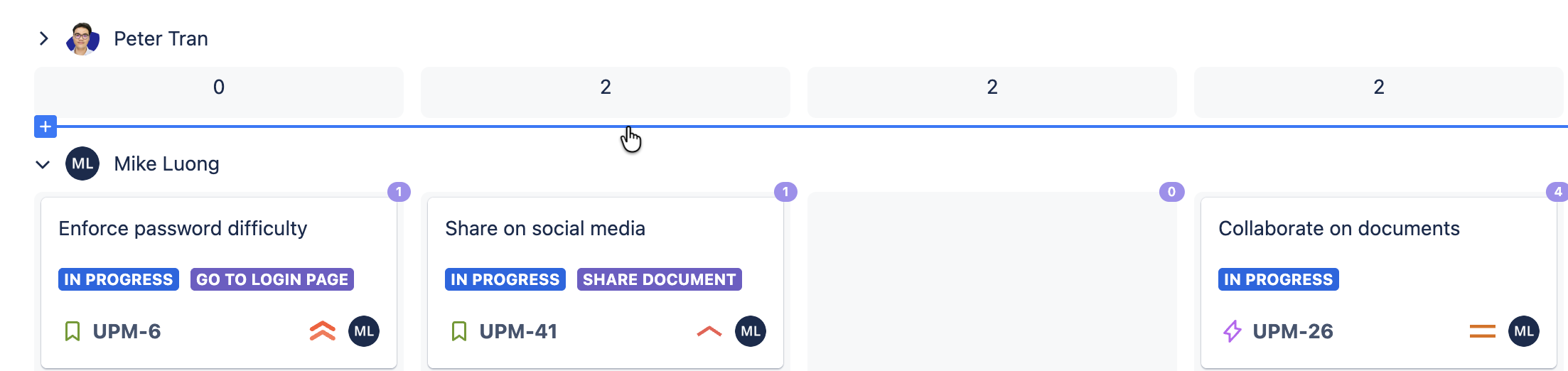 You can also collapse or expand each swimlane to narrow down your view (using the arrow symbol). This hides all the cards and displays only the number of cards in each column.