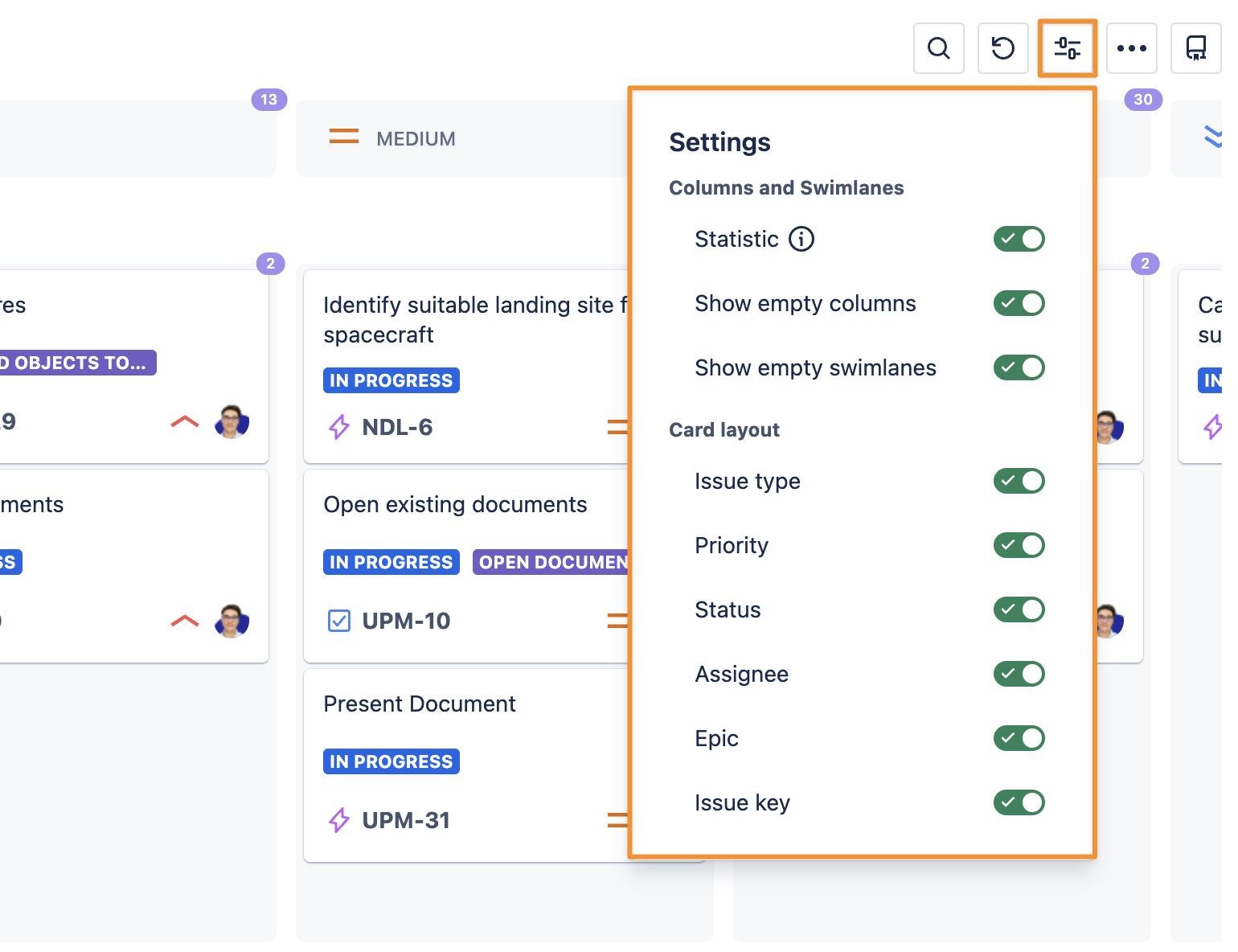 You can customize your Kanban board experience by adjusting User Settings. To access these settings, click the tuning icon in the top-right corner of the board.